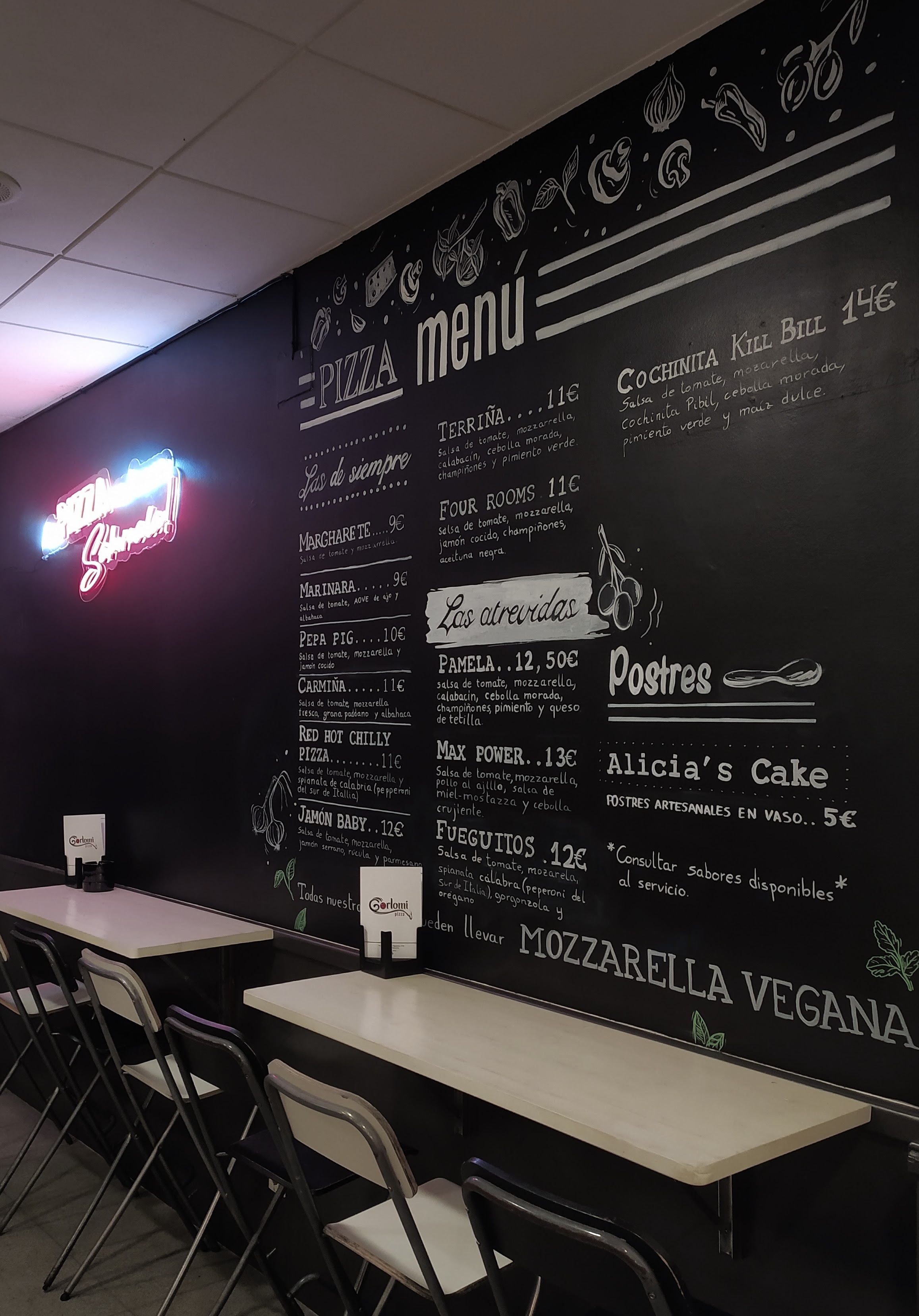 Más sobre GorlomiA nosotros tampoco y para asegurarnos de que pruebas nuestras pizzas en su momento óptimo no realizamos envío a domicilio y sustituímos el teléfono por una selección musical que no te distraiga de lo realmente importante ¡Nuestras estupendas pizzas artesanales!